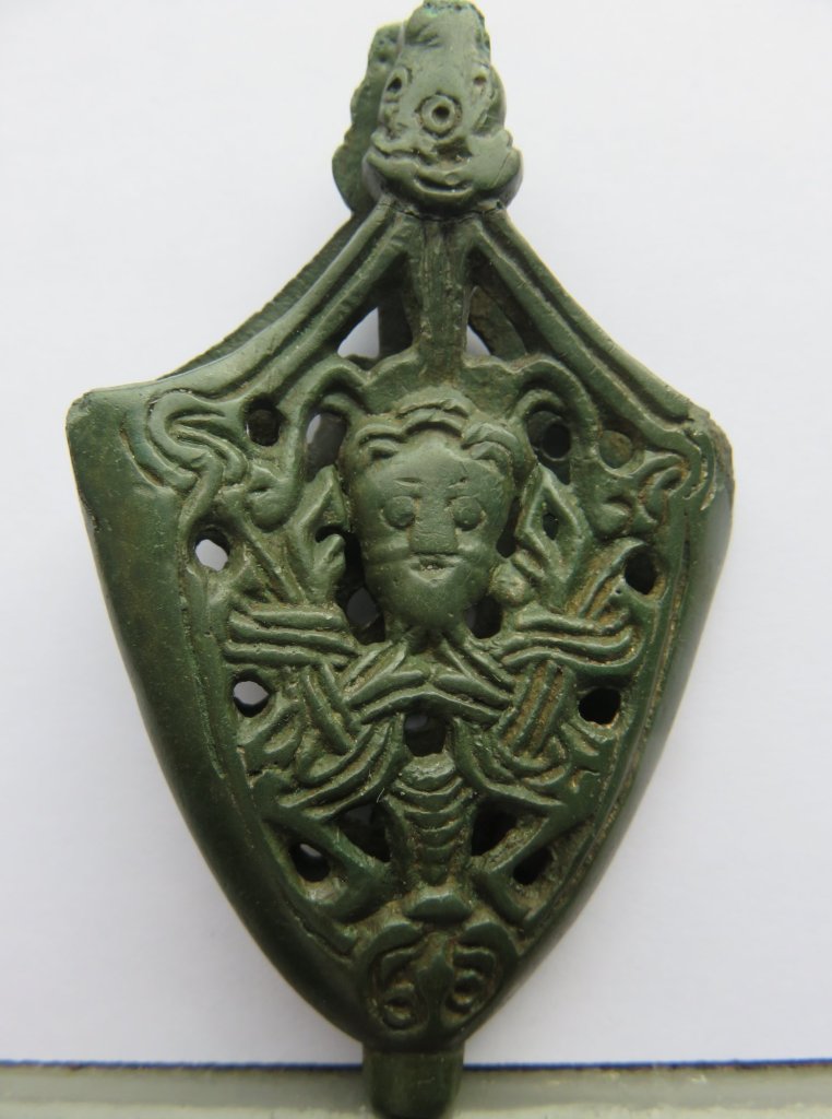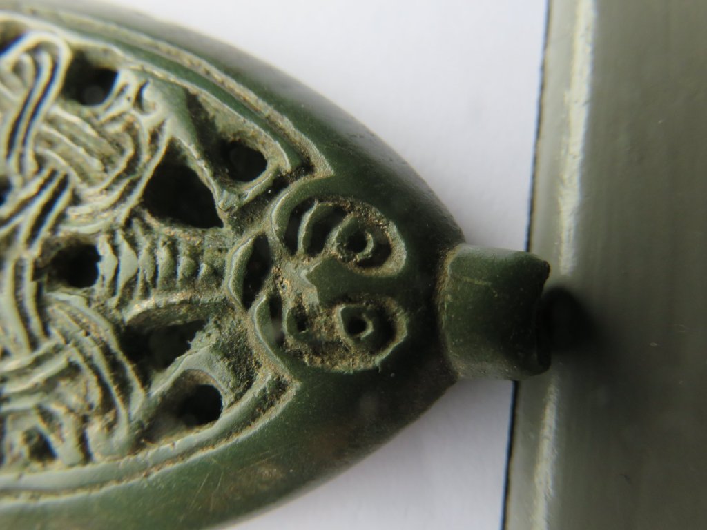 This sword chape depicts a face within Borre style interlace/knots wich, concerning to Ru Smith, is connected to the Hávámal story of Odin’s self sacrifice. He highlighted the design elements of the example he has and clearly a figure can be seen, hanging within interlaced branches with leaves. I additionally would suggest another proof of Ru Smith’s theory, as on the top of the tree – Odin is hanging upside down in the tree – a face of a bird can be seen wich very much looks like an owl. As everyone knows, the owl is known for its wisdom. With its feet connected to the -seemingly barn – owl, he connects with its wisdom.