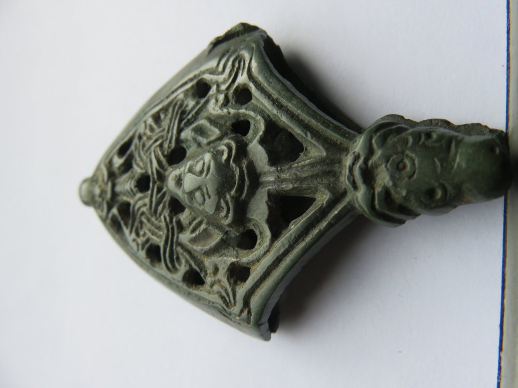 This sword chape is from the 10th century and was found in the Ukrain in the Vinnitsa region. Several of this type of chapes were found in settlements (Araisa, Steigen, Birka, Hedeby, Nimschütz) rather than graves and without their swords. Charlotte Hedenstierna- Johnson notes that “the total number of known sword chapes dating from the Viking Age is extremely limited” and that their distribution differs from that of the swords. “In fact they are generally uncommon, and even though they are mainly connected with a high status weapon, the sword, this is not always the case. They also appear on their own and seem to have a meaning and value apart from being the decorative end of a scabbard.”