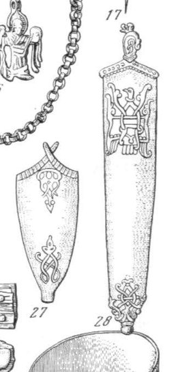 On these chapes the typical Scandinavian animal ornament had been replaced by a oriental palm (motif), although the Nordic nature of the form is there, the openwork charachter had been replaced by a closed casting.