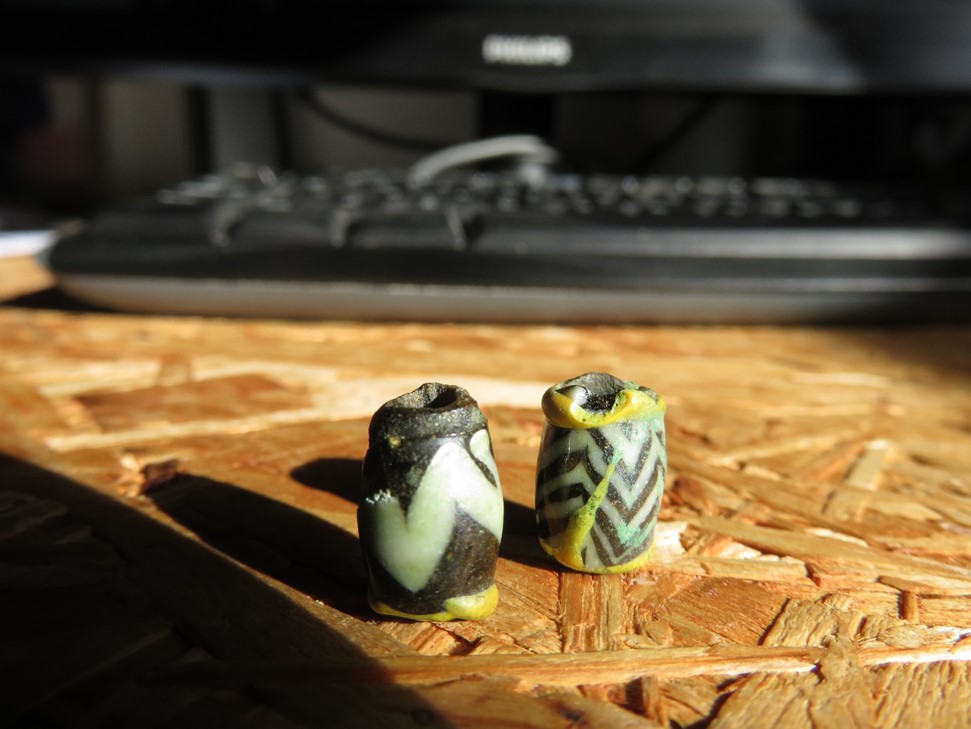 The below pictured, highly decorated, beads were found in Latvia and may be of Byzantine origin. They are 12/13 mm in length. The left one weighs 1.55 grams, the right one 1.82 grams.