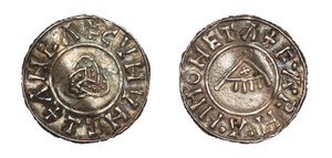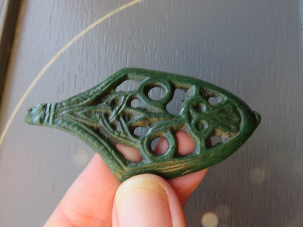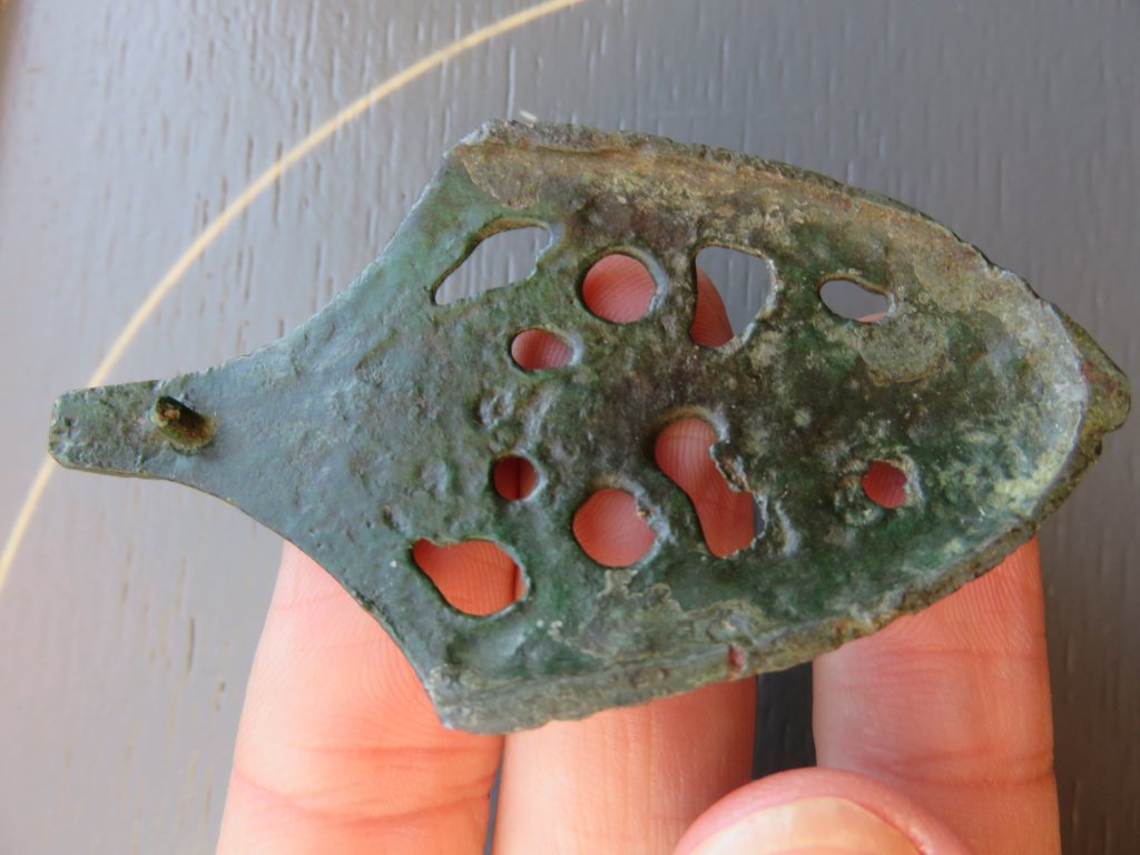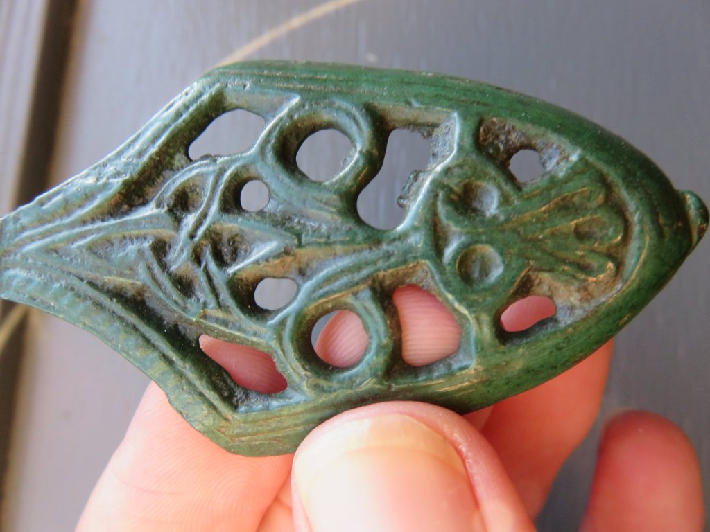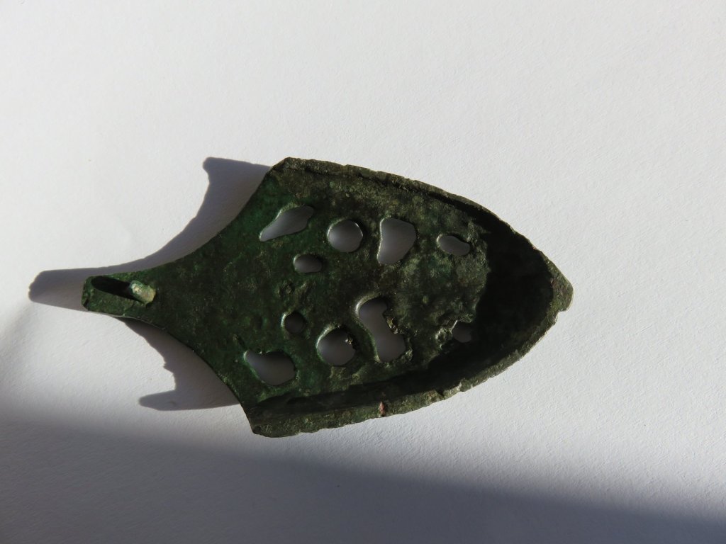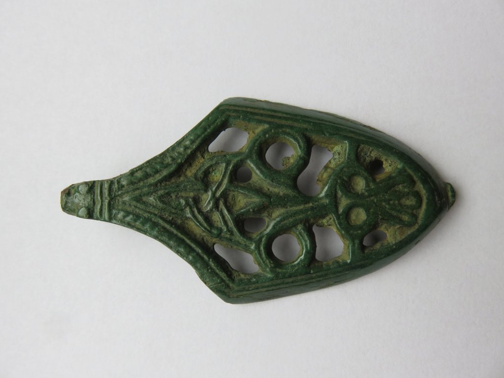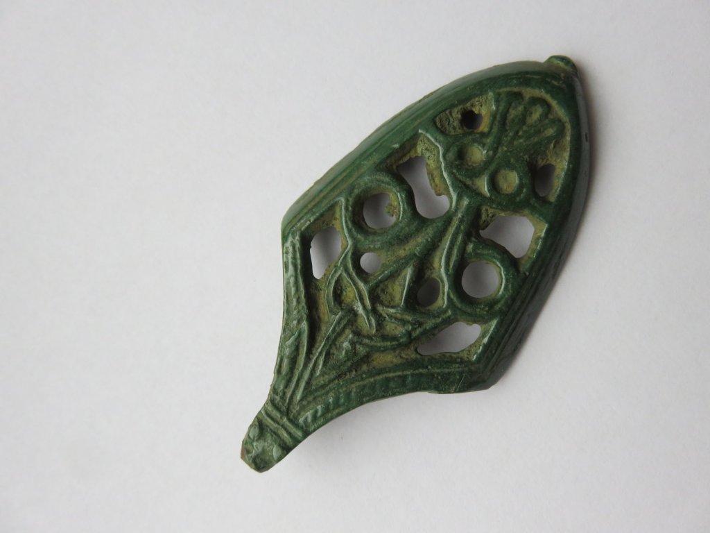 This sword chape – found in western Latvia – is also of a very rare type. It is one half of a chape. Two halves were casted and attached together with lead. Due to soil conditions, the lead could have been corroded or dissapeared, leaving the chape seperated in one half. Peter Paulsen has catagorized this kind of sword chape among the bird type sword chapes of the Viking Age, Örtbander mit germanischer Vögelmotiv. With a bit of phantasy a bird like form can be seen, with the head of the bird formed by a trequeta form motif. The trequeta is a very old Indo-European religious sign. Many religions consider the number 3 as a holy number. The trequeta sign had been found as interlacing circles on 5000 year old Indian religious statues. In Europe the trequeta symbol was found much later, from the 8th century A.D. The motif is being found – for example – on the coin die of the Viking kingdom of York on the so called ‘trequeta pennies’