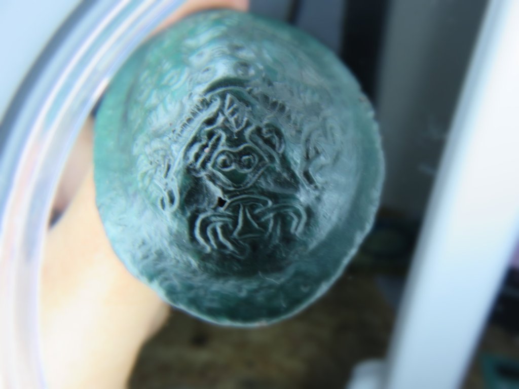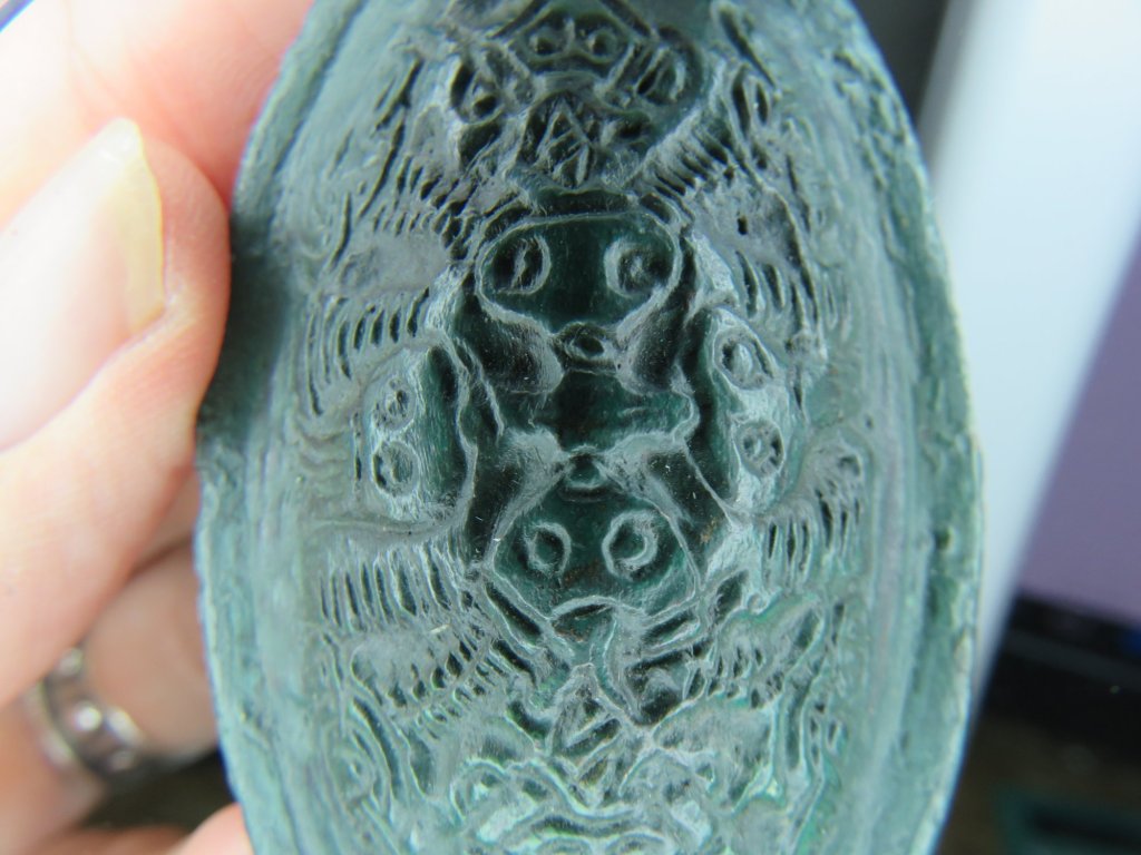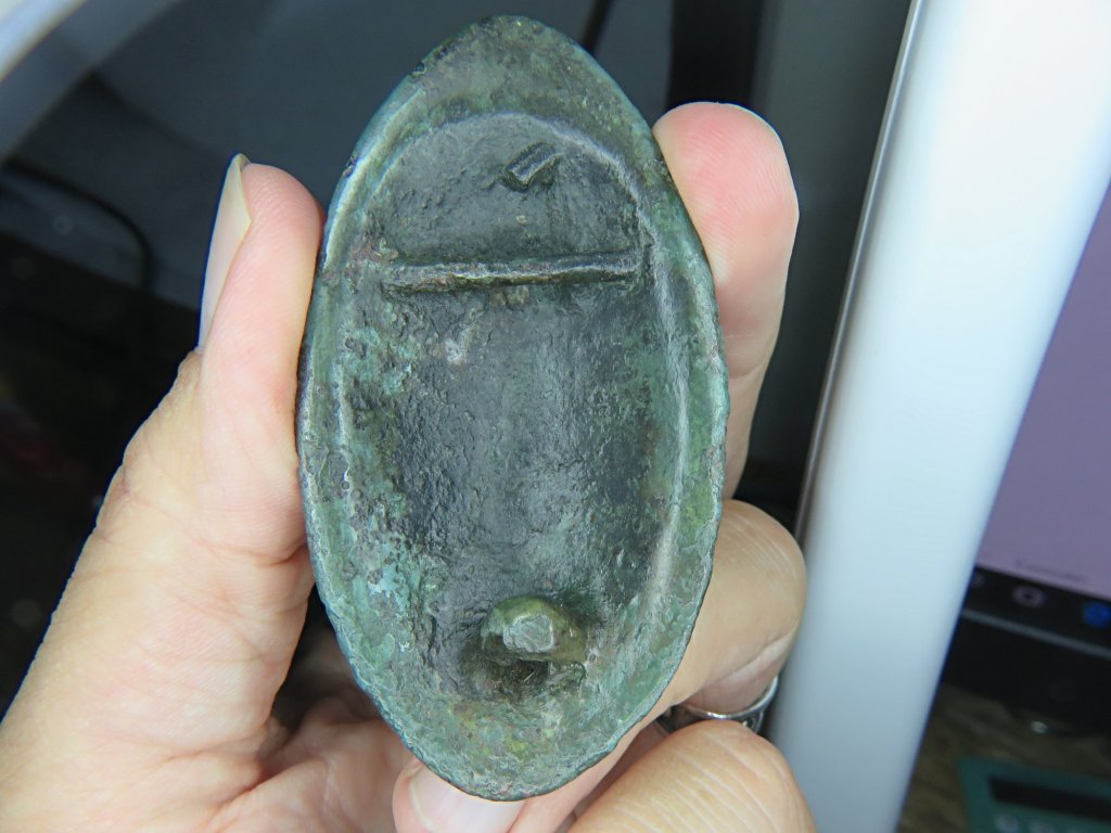 It has a low relief decoration of Borre-style interlaced beasts with four prominent heads to the centre, catchplate to the reserve. Consulted Barry Ager – formerly curator Early Middle Ages at the British Museum responded when consulted: ‘It appears to be a Finno-Ugrian imitation of the Viking oval brooch of around the 10th century. From the Gulf of Finland/Lake Ladoga region perhaps..’