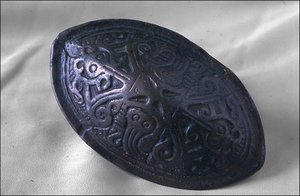 In the museum of South-Karelia in Finland a similar example can be seen. Its description says: ‘Oval tortoise brooche of bronze, found at the Kauksila burial ground. Oval clasps were used to fasten the woman’s outfit at the shoulders and also to carry a heavy jewellry arrangement. Large oval brooches with acanthus-pattern ornamentation were used in Karelian areas at the times of the crusades’.(see image