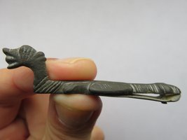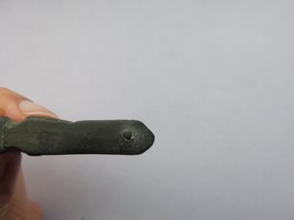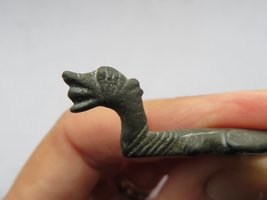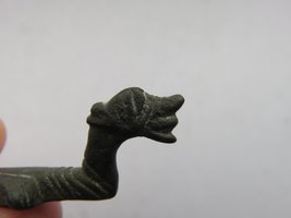 Having been sold as a ‘Viking ‘ship-shaped’ strap end in 2009, over the years it become clear that stylistically this artefact isn’t from the Viking Age, but from the 12th century. The form and execution of the head is romanesque in style, wich also can be viewed on artefacts from the Anglo-Norman era onwards into the 12th and early 13th century. It is an unusual zoomorphic strap-end modelled in the round wich regarding the form of the head finds a strong parallel in the strap fitting registred in the Portable Antiques Scheme under SF-1EADD4. Barry Ager pointed to a series of similar like formed objects.