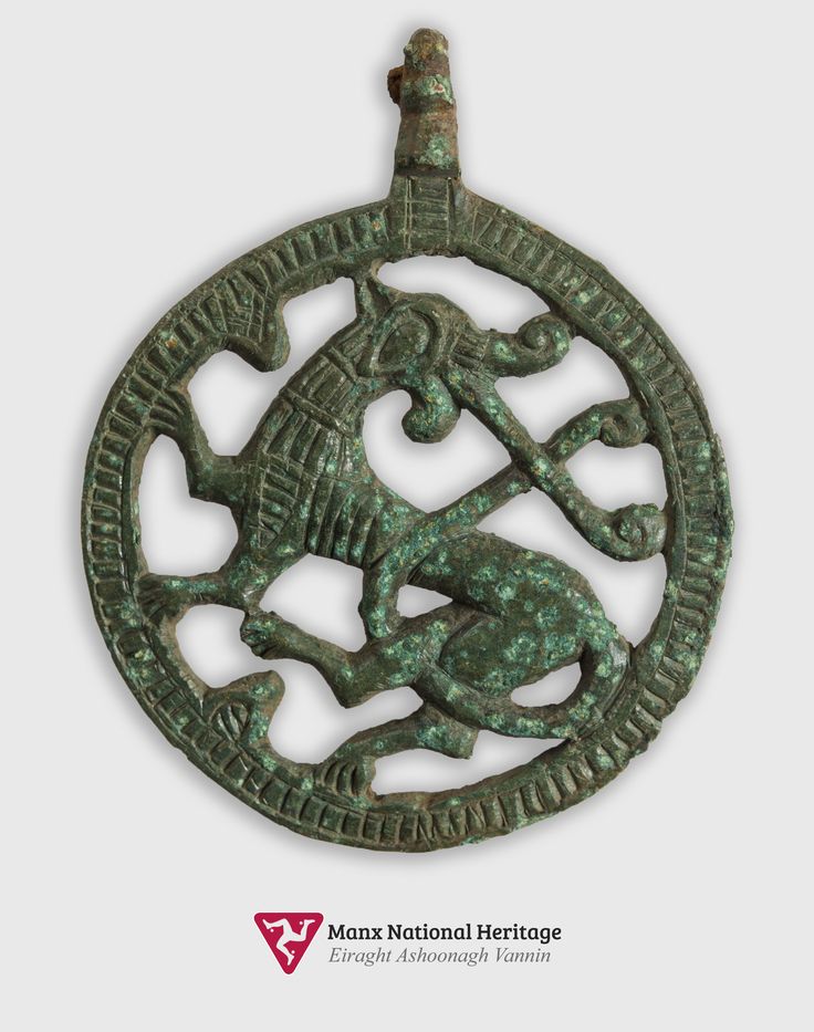Addition: a – somewhat – imagery like similar pendant I have found on the internet, earmarked as belonging to the Manx museum (Manx National Heritage). The style is far more openworked, giving in the possibility of having been a horse harness pendant. Its similarity lays especially in the feel of the artefact and the backward depicted east, although the Manx example – considering art style – seems to develop further in the direction of the Urnes style. The distinct “striped” border decoration on the pendant is striking similar to the Basingstoke example. I have asked the Manx Museum for more information on their example.