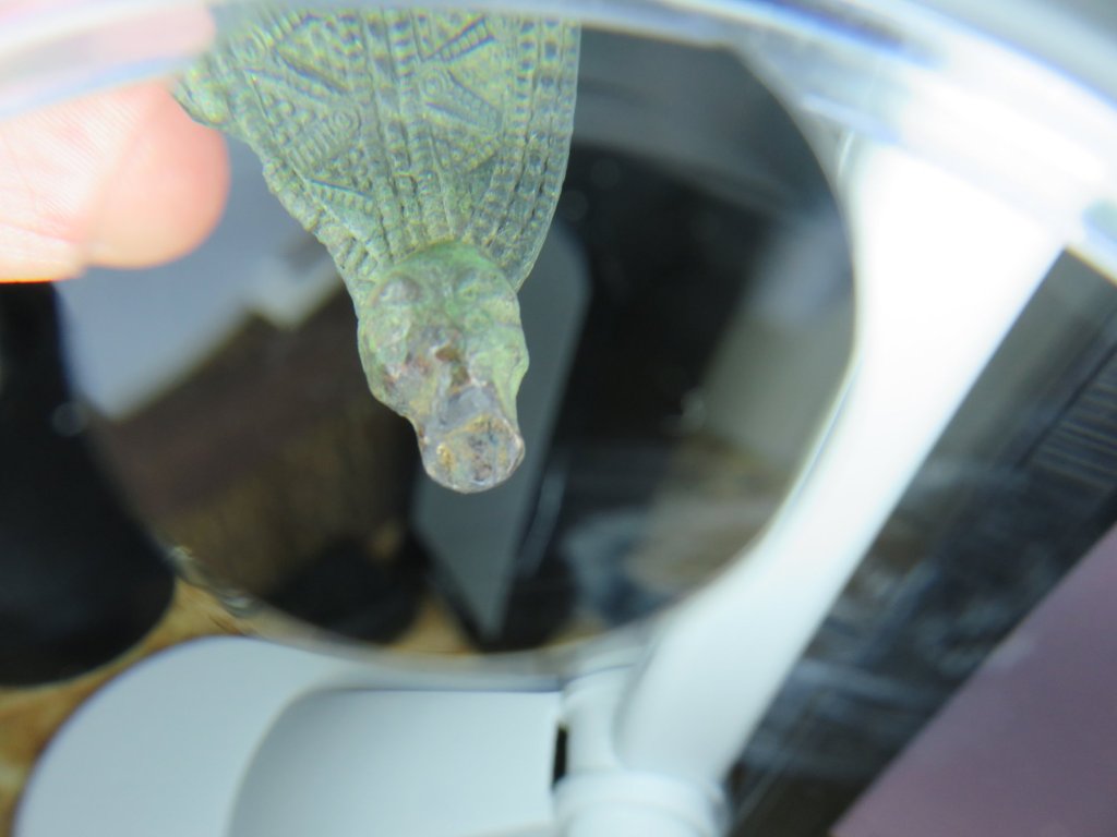 The bottom threedimensional image seemingly gruesome is far from clear as some minor damage to that part or a bit of iron corrosion blurrs our vision of what this may depict. The – six – dots in triangle motifs are reminding on the triangle in pellet motifs like on bracelets and Thor hammers of the Viking Age. The detail of execution though is more refined and detailed. The item could have been a ‘one-off’ as I – at the moment – aren’t aware of similar(like) objects from the Viking Age.