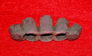 A viking bronze 5 finger sword pommel of the so called Petersen type ‘O’. It is dated ca. 900 – 950 AD, in perfect excavated condition with deep age patina. About 1 “tall x 2.2 “wide. Found in Lincolnshire, England.