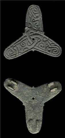 ‘The trefoil brooch is actually not a brooch but a strap-distributor, perhaps for a harness, of a type known from Iceland and Scotland. The projections at the side near the central plate show that the design comes from Carolingian baldric mounts, which have a similar shape. The central hole will have original held a rivet. The art style is not Ringerike, but Jellinge, although it seems to have been misunderstood in places. I’d place it in the first half of the 10thC.’